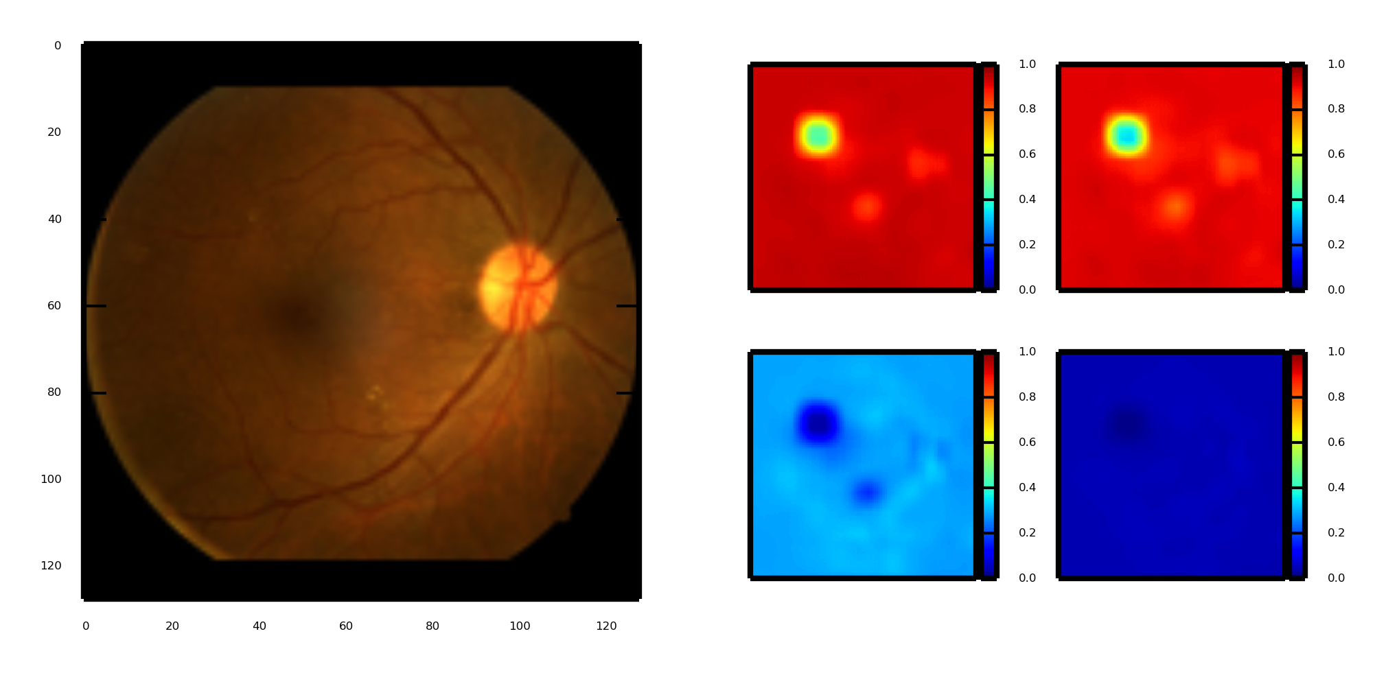 A 3rd percentile solution (20th out of 616 place) for the Kaggle Diabetic Retinopathy (DR) Challenge, see me on theleaderboard here. A ConvNet that classifies the severity of DR in an image of an eye fundus (0-4 scale). A writeup explaining the research and code is availableonline. The image of heatmaps shows the probability of each of 1 of 4 pathological classes being output if that pixel was occluded. Here the ConvNet learned the 2-3 pixel pattern in a 128px image for a hard exudate (click on the image to zoom in).